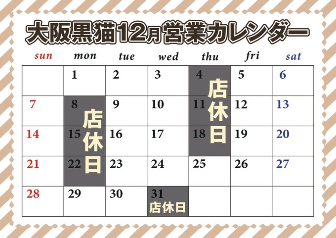 心斎橋・ 宗右衛門 黒猫メイド魔法カフェ大阪店わむ📚🖋1/25 生誕&周年さんがリポスト黒猫メイド魔法カフェ 大阪店@kuroneco_osaka·大阪黒猫12月営業カレンダーですにゃ! 皆様にはご迷惑をおかけしますが よろしくお願いいたします。11131,508