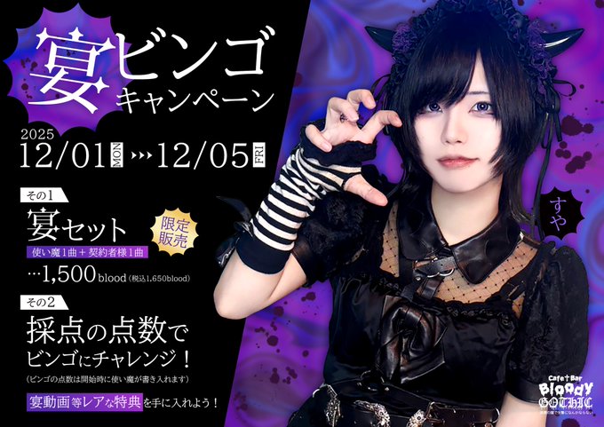 難波・日本橋 クロナイアビー🎀@クロナイ@kuronai_abbey·16時間明日からとっても楽しそうなキャンペーンが始まるようです❣️ チェックチェック♬♬♬引用クロナイ┃大阪・日本橋🦇魔界コンカフェ@bloody_gothic_·19時間😈御案内🎵 🚩宴ビンゴキャンペーン🎤 宴セット1500blood(税込1650blood) (使い魔1曲+契約者様1曲) とてもお買い得なセットガ登場🎙️ そして👀採点の点数でビンゴにチャレンジ⚔️豪華特典ゲットのチャンス🙌 この機会をお見逃しナク2108