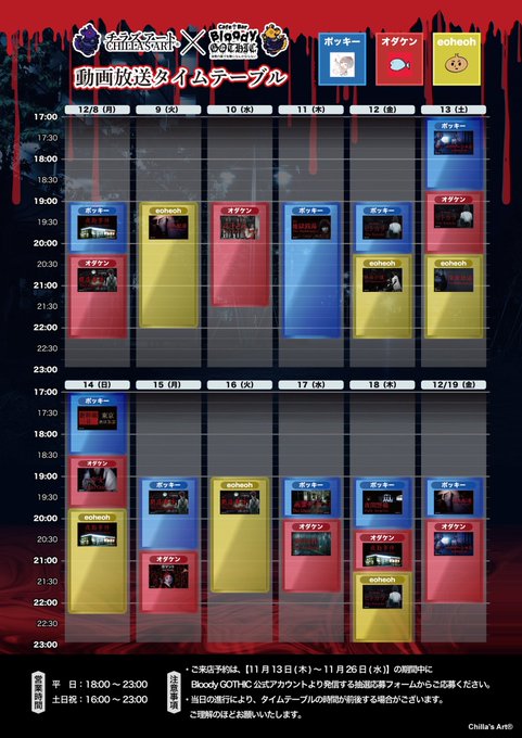 難波・日本橋 クロナイクロネ🪙クロナイさんがリポストぱるてのんグループ@公式@parthenonpro_·7時間Chilla's Art(@ChillasArt ) × BloodyGOTHIC(@bloody_gothic_ ) コラボカフェイベント 日時指定による抽選予約の締切は、 本日24:00までになります📢🩸 一部時間帯の倍率が高くなっております🙇 現状は第三候補までご入力いただけますと、 いずれかの時間帯にお席の確保ができそうてす😊✨引用ぱるてのんグループ@公式@parthenonpro_·11月13日Chilla's Art(@ChillasArt) × Bloody GOTHIC/クロナイ (@bloody_gothic_) コラボカフェイベント👣🩸 日時指定による抽選予約を開始します🥾 ⏬ご来店の抽選予約はこちらから⏬ https://docs.google.com/forms/d/e/1FAIpQLSehzN3-kZgYvUGdTVqJ59qJIn1miq6ggG-H4vPvT-EyzTG-hg/viewform?usp=dialog… 【抽選期間】 11月13日(木)~11月26日(水) 【当選連絡】 11月27日(木)~11月28日(金)141,305