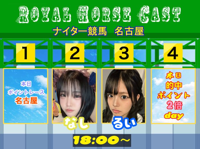 心斎橋・ 宗右衛門 ROYAL HORSEROYAL HORSE🏇ろいやるほーす@royalhorse2024·11/26(水)本日の出走キャスト🏇 本日ポイント2倍DAY❣ ナイター競馬🌃名古屋 梨 @rh_uma_nashi るい @rh_uma_rui #競馬 #コンカフェ #心斎橋 #d払い123