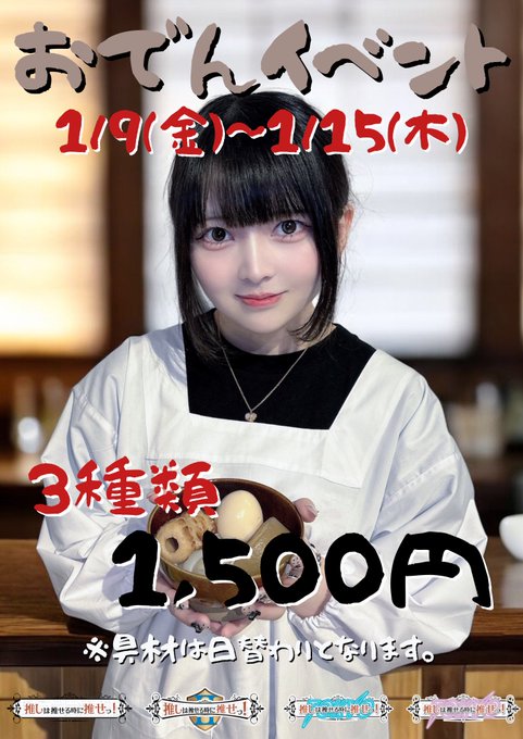 ここるさんがリポスト推し推せっ!コンセプトカフェ❦@oshiose_concafe·🔲1/10 営業時間 18:00-Last🔲 推し推せ1号店 🍲おでんイベント🍢 推しつまみも同時開催中🥔🥢 18:00 ひかり@hikari_oshiose あい@ai_oshiose ここ@coco_oshiose りりあ@riria_oshiose みか@mika_oshiose ここる@cocoru_oshiose 19:00 すい@sui_oshiose 21:00 そら@sora_oshiose 22:00さらに表示517961