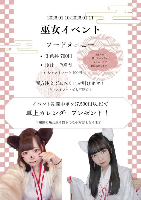 難波・日本橋 Cure Castle(キュア キャッスル)CURE CASTLE🏰(キュアキャッスル)1/1.7.8店休日さんがリポストみづき!2/7生誕@mizuki390·3時間きょから巫女さん‼️16時からまてり引用CURE CASTLE🏰(キュアキャッスル)1/1.7.8店休日@Cure_Castle·1月8日1月10日〜12日は 巫女きゅあする🦊⛩✨ ▶️16時オープン🌟 その場でパシャリ📸 いただきますピン写メ付き お雑煮とちらし寿司🍱 巫女さんブロマイド付きオリカク🍹 ¥7000以上のシャンパンにはおみくじ付き♫ キャスト一同巫女さん姿でお待ちしてます❤️ x.com/cure_castle/st…17316
