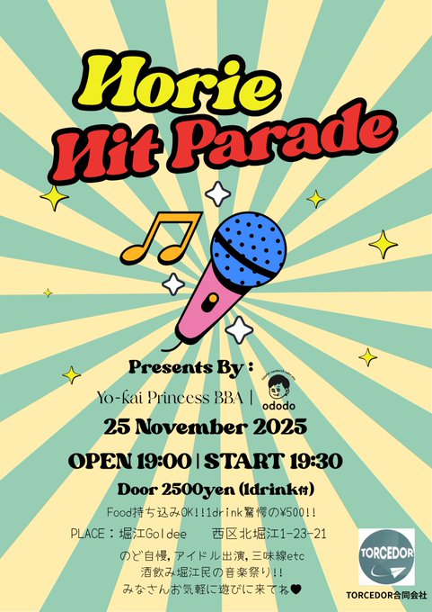 難波・日本橋 ロリータメイドカフェ merimero(メリメロ)きらら✨@merimeroさんがリポストTORCEDOR(トルセドール)@torcedor2023·11月24日明日です。 近くの方お待ちしてます🍺 11/25(火) Presents By Yo-kai Princess BBA 「Horie Hit Parade」 📍北堀江Goldee ※制作案件 ※着席でのイベント予定 オープン19:00 スタート19:30 予定 2,500円(1ドリンク付) フード持ち込み可 ピンクレディー完コピ 三味線 DJ のど自慢さらに表示引用TORCEDOR(トルセドール)@torcedor2023·11月22日🆕11/25(火) Presents By Yo-kai Princess BBA 「Horie Hit Parade」 📍北堀江Goldee ※制作案件 ※着席でのイベント予定 オープン19:00 スタート19:30 予定 2,500円(1ドリンク付) フード持ち込み可 ピンクレディー完コピ 三味線 DJ のど自慢 などパーティー好きの堀江民が集結✨さらに表示32368
