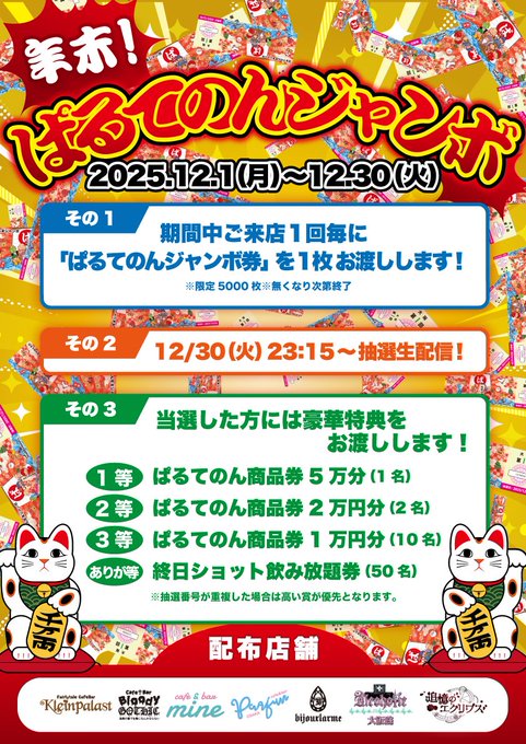 難波・日本橋 クラパラお殿@クラパラ@KlePala_otono·5時間すげーー!!! おれもやりたいこれ!!引用ぱるてのんグループ@公式@parthenonpro_·11月21日✨ぱるてのんジャンボ 開催のお知らせ✨ 期間中の対象の大阪店舗へご来店1回毎に 「ぱるてのんジャンボ券」を1枚お渡しいたします🎶 結果は12/30の抽選生配信で発表❗️ 当選した方には、ぱるてのん商品券5万円分 など豪華特典をプレゼント🎁 ご参加お待ちしております🌟 開催期間:12/1㈪~12/30㈫4161