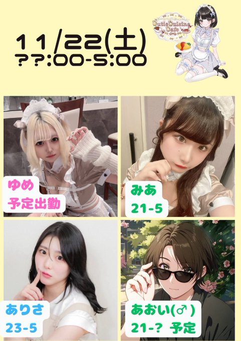 心斎橋・ 宗右衛門 Concept cafe MoaRabi🤍大阪コンカフェ MoaRabi🤍@MoaRabi_concafe·11/22 20:00おーぷん🐰🌙 もも@momonchu_2 20-5 るる@MoaRabi_ruru 20-5 むぎ21-5 ひめ22-1163
