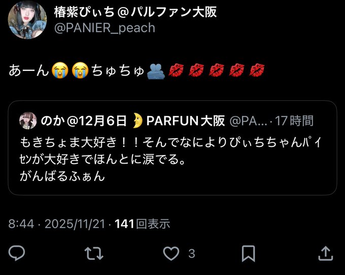 難波・日本橋 パルファン 大阪店のか@12月6日🌛PARFUN大阪@PANIER_noka·パルファンはキス魔しかいないようです🙋♀️内容の警告: 成人向けコンテンツこのポストは、成人向けコンテンツを含むポストとしてXによりラベル付けされています。表示127517