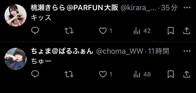難波・日本橋 パルファン 大阪店桃瀬きらら@PARFUN大阪@kirara_pfosk·1時間開国ニダ👆🏻✨ 明日明後日いないから今日きてほしいよーーわーー😻💕 #コンカフェ #大阪 #日本橋 #オタロ引用パルファン中の人@pfosk_sub·1時間0:52🏰パルファン大阪開国しました🏰 本日は 🎲LINEクエスト 🎤カラオケキャンペーン開催中❕ 沢山歌って沢山クエストをクリアしちゃいましょう♡ 本日も23時まで❕ 皆様のご入国お待ちおります♪114290