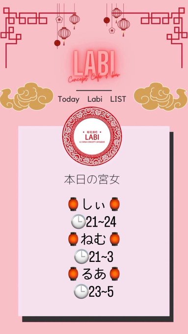 心斎橋・ 宗右衛門 LABILabi🏮コンカフェ大阪@Labi_osaka·🏮11月19日出勤宮女🏮 🏮しぃ@Shi_Labi 🕒21~24 🏮ねむ@_babu_milk_ 🕒21~3 🏮るあ@Lua_LABI 🕒23~5 今日も一日よろしくぬん🧏 #labi #ラービー #コンカフェ #チャイナ #中華 #コスプレ #大阪コンカフェ #ミナミ #宗右衛門町197