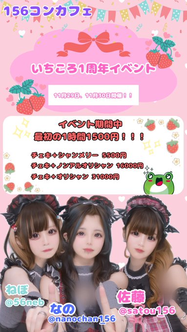 心斎橋・ 宗右衛門 cafe&bar いちころ🍓いちころ-156-🍓大阪コンカフェ@ichikoro5656·11月後半シフト🍓 ありがたいことに156 1周年を迎えました〜!!!これからもよろしくお願いいたしますっ🙇🏻♀️ (1年経ったしピルクルもー入れてくれ)23202