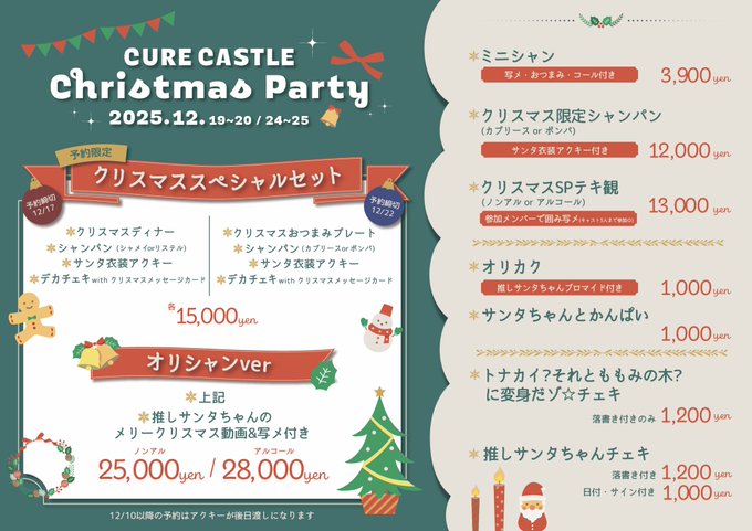 難波・日本橋 Cure Castle(キュア キャッスル)CURE CASTLE🏰(キュアキャッスル)12/8.15.22店休日@Cure_Castle·6時間19日・20日と24日・25日は クリスマスイベント🎅🏻🌟 アクキーやデカチェキなど 豪華特典付き🎁スペシャルセット🍽はご予約限定です💗 (締切は来店の2日前まで) ※フード単品はございません🙇♀️ 写メ付きミニシャン🥂 アクキー付き限定シャンパン🍾 囲み写メ付きSPテキ観🎡 サンタ姿でお待ちしてます❤️引用CURE CASTLE🏰(キュアキャッスル)12/8.15.22店休日@Cure_Castle·12時間12/19・20 & 24・25は きゅあクリスマス🎄🌟 今年もスペシャルセットが登場🍽🎅🏻 ※前半と後半で フード・シャンパンが異なります 12/9までのご予約で 全ての特典を当日お渡し🎁 (10日以降のご予約はアクキー後日渡し) ※アクキーの単品販売はございません🙇♀️ サンプル画像は各キャストXにて🎵 x.com/cure_castle/st…1418