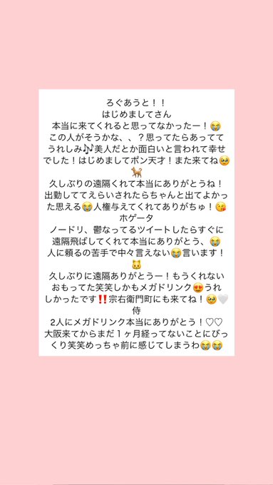 ぷち🍮@メリメロ@puti_merimero·9月19日おきゅおわ❣️ はじめましてでかんぱいしてくれたちょー元気なひめさんのごしゅ、えんがわブーム長めのごしゅ、チェキ撮るのうますぎ(イケボ)ごしゅ&かわいいおもしろ最強お嬢様!ほんとうにありがとう♥たのしすぎた>< お酒飲むとお喋りマシーンになってしまうのほんとうにごめんなさい引用ぷち🍮@メリメロ@puti_merimero·9月19日ちと髪が荒れているけどメリメロいまちゅ #コンカフェ #大阪コンカフェ #日本橋 #オタロード17295