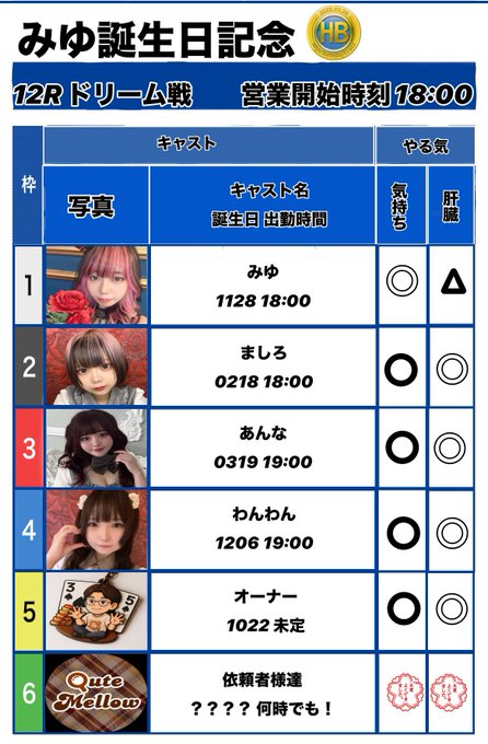 難波・日本橋 Cafe&Bar QuteMellow -きゅーめろ-あんな🎀@annatan_0319·11月25日みゆちの生誕だよーーー❣️ もちろんあんなもいます🙂↕️❤️ ぜーったいにみんなでお祝いしよーね🥳✨引用みゆ11/28誕生日会ありがとうございました@MIYU__Qm·11月25日✨告知✨ 11/28㈮ 18:00~ 初めての個人イベント みんな私の誕生日お祝いしてください🙇♂️ オリシャン数少ないですっ! 下ろしてあげるよ!の方はご連絡ください♡ あと何時頃いくよーも連絡ください😭 頑張ってみんなが来るまで生きます笑 ほんとに少しでもいいんで来てください🙇♂️ @qutemellow5209