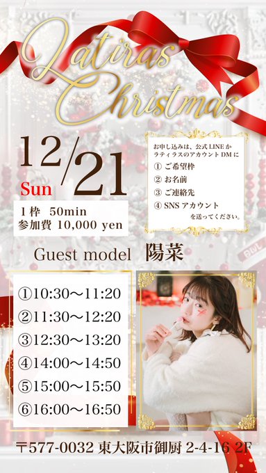 難波・日本橋 Overdose椎葉 菜凪衣 / Nanaeさんがリポストlatiras@latiras0401·12月21日(日) 陽菜 @hina_ptrm × latiras撮影会 開催いたします!! 陽菜ちゃんとクリスマス撮影しませんか? ご応募は、ただいまから latiras公式LINEか @latiras0401 のDMでお待ちしております! *お返事にはお時間いただきます。陽菜🐤12/21クリスマス企画🎄515488