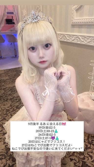 固定ぱるにゃんこ💘@haruna_catwalk·9月18日19,20,21,23,28 います🙋♀️︎✨✨ 19~21は三連勤‼️がんばるよー(тロт)❣️ 会えるんちゅ、いる❓❓😭引用Cat walk【キャットウォーク】@Cat_walk91·9月13日🎀9/16-9/30お給仕予定のお知らせ🎀 ❤︎営業時間❤︎ 平日 17:00-23:00 土日祝 13:00-23:00 ※オープンはキャストの出勤時間に伴います ❤︎システム❤︎ ノンアルコース ¥1,000(税込)/1h アルコールコース¥1,500(税込)/1h ⬆️9/30までの特別価格✨ぜひこの機会におまちしてます🎀 𝜗𝜚271,832