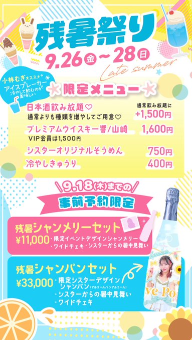 ぎん💙ラブポイント@LP__gin·9月10日よやく〜^_^引用♡Cafe LovePoint オタロード店♡@Cafe_LovePoint·9月6日ㅤ 09.26(Fri)〜09.27(Sun) 🐬🌱残暑祭り開催🎆🎉 前回好評だった、 🥂限定シスターデザインシャンパン 🎀限定イベントデザインシャンメリー(シスター画像ではありません) を🤍09.18までの予約限定🤍で作成します✨🥂 ご予約は、昨日のシスターまでDMお願いします🎀さらに表示15516