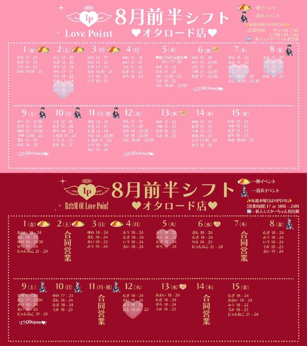 おと🎶ラブポイント@LP_otochu·8月11日13日18:00~23:00 ぜろさんの代わりに追加になりました❗️引用おと🎶ラブポイント@LP_otochu·7月31日8月前半⬇️ 1日 18:00~23:00 2日 18:00~23:00 5日 18:00~22:00 7日 17:00~23:00 8日 15:00~23:00 9日 17:00~21:30 12日 18:00~23:002249