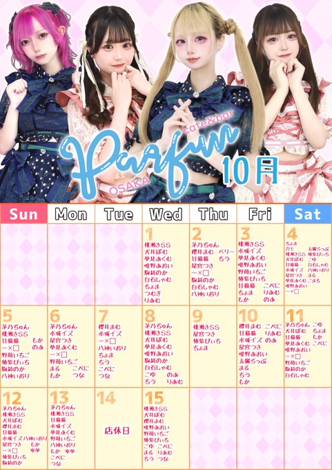 あおい🦈@PARFUN大阪@aoi_pfosk·9時間みんながいる日書いてるよ〜😸😸😸引用パルファン大阪店┃日本橋💐9/20グランドオープン❕@par_0808·10月2日✧꒰ 10月前半出勤情報&月間イベントカレンダー ꒱✧ パルファンたちのシフトや お得なキャンペーンはこちらをチェック!✨ https://timetr.ee/p/parfun_osk あなたの推しパルファンに ぜひ会いに来てくださいね🩵 ※シフトは急遽変更させていただく場合がございます。 #パルファン #パルファン大阪19672