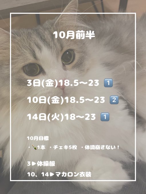 固定こゆ@パルファン大阪@PANIER_koyu·10月前半お給仕予定🗓🎃⭐️ 4日 ちょまさんハーフアニバです!!︎|◜𖥦◝ //)💕 9月ほとんどいなかったから10月はがんばるぞー‼️のきもち‼️10月もたくさん素敵な出会いがありますように♩来店予約などなどお待ちしております♩♩4128