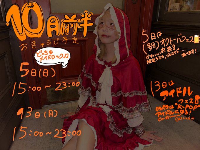 紅葉🐾໊@クラパラ@KlePala_kureha·10月前半お給仕予定❣️ どっちもイベント(のはず)!!! 両日メイドロックに任務です🎸 お待ちしております^._.^ #コンカフェ #コンカフェ嬢 #大阪 #日本橋 #難波 #ミナミ #オタロ14173