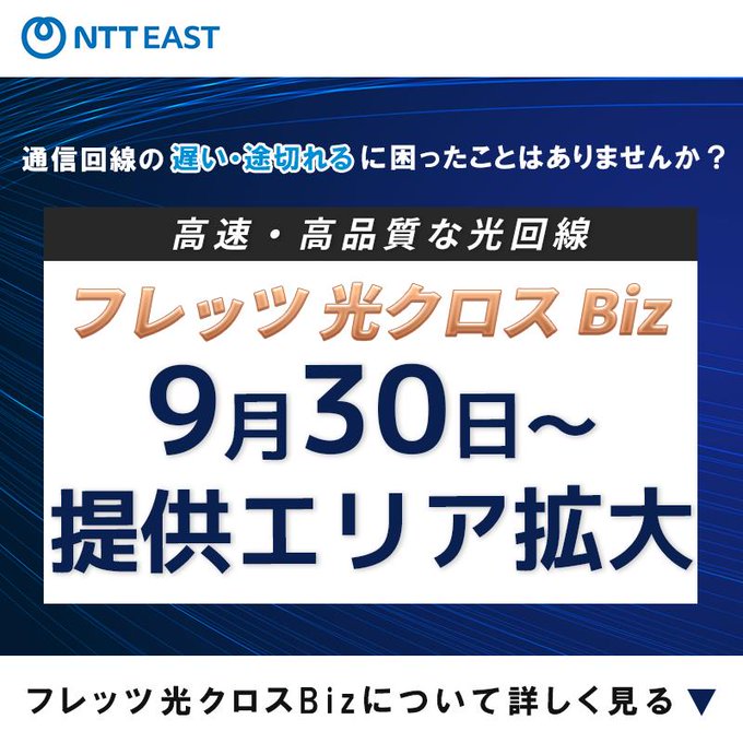 NTT東日本サービス ビジネスお役立ち情報@NTTeast_s_cs/ 9/30~提供エリア拡大! 快適なインターネット環境が 働き方を変える! \ 「クラウドが重い?」 「オンライン会議が途切れる?」 そのお悩み 「フレッツ光 クロス Biz」で解決! ▼画像タップして詳細をチェック▼ntt-east.co.jpから375,861プロモーション
