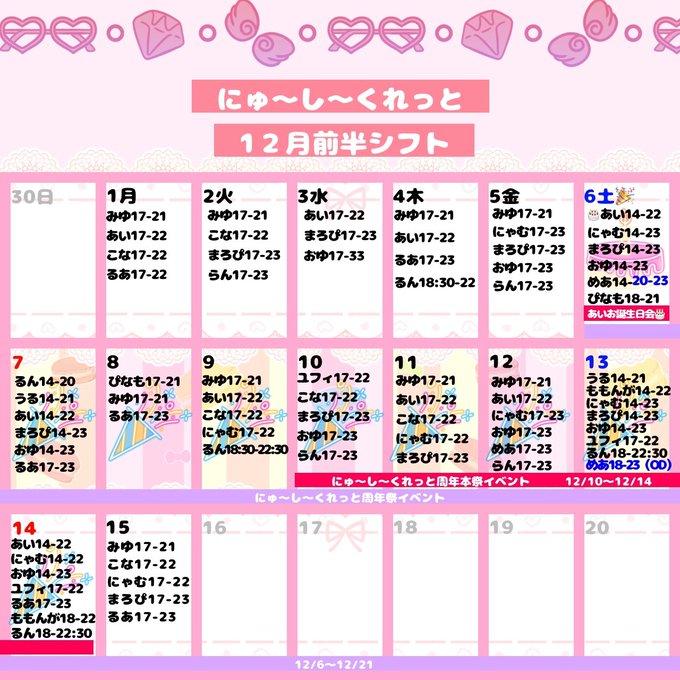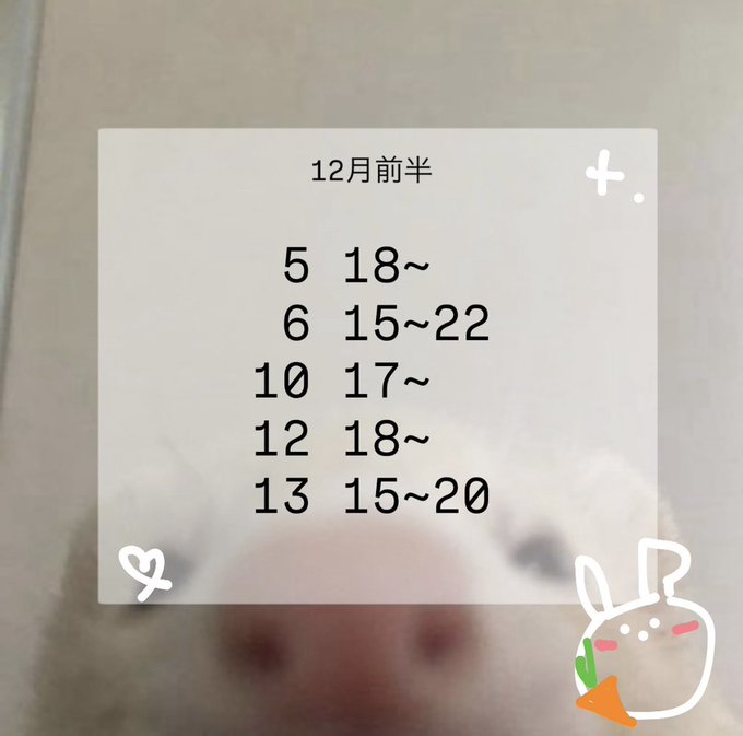 難波・日本橋 雪国のお絵かきメイドカフェらてめぃどくらん🤡@四季グループ@kuran_latte·11/29のおきゅおわできてなかった~😭 お礼ツイもこの後すぐポストします🙏💦 #くらんの香盤表 12月の予定は↓↓↓37344