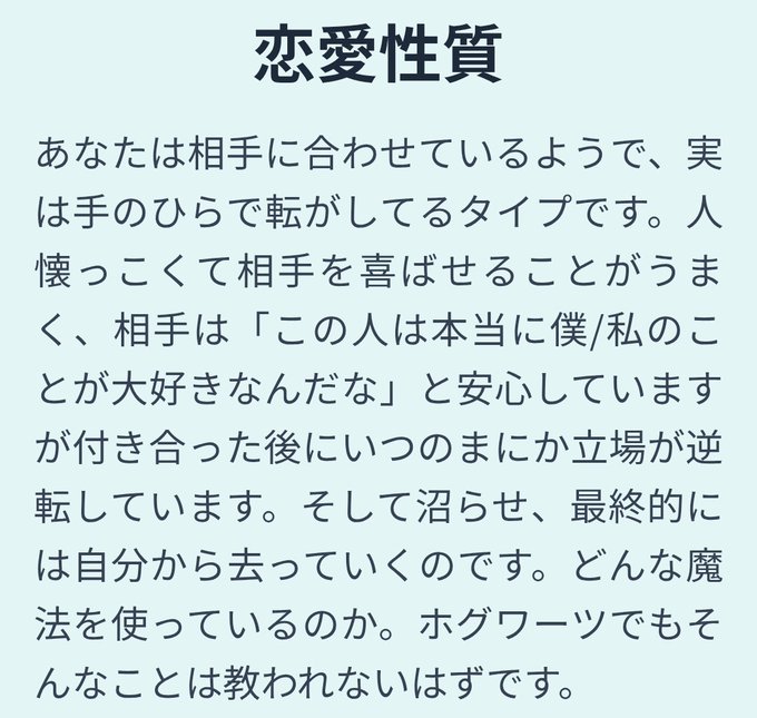あい@クラパラ@KlePala_ai·最近はやってますね恋愛タイプ診断 私はロマンスマジシャンでした 最後は自分で相手を捨てるらしいです 普通に最低な女です そんなことしません私は😁タブン😁213,896