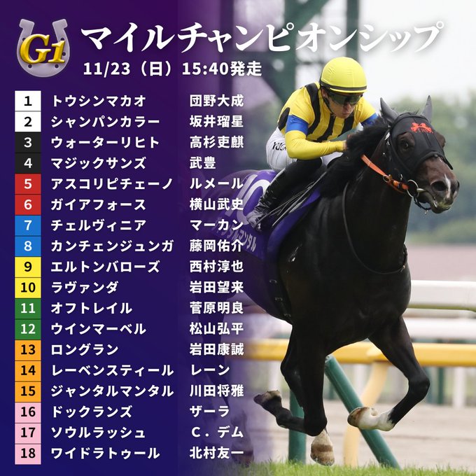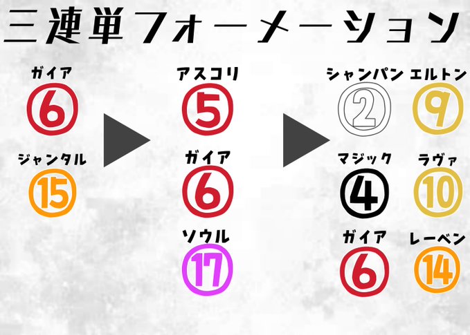 梅田・京橋 おたくばぁ えんじぇるこはく@AGLpro_kohaku·3時間はい。勝ちましたね(*^^)v もうこんなの本命ガイアフォース一択ですよ 赤枠ですよ赤枠 先行馬にとって最高の枠じゃあないっすか‼️ てことでね、 三連単ボックスの、6-15-17です。 ピチェーノさんは冬毛モッフモフになっててちょっと消し馬にさせてください…引用正方形のプロフィール画像JRA-VAN公式@JRAVAN_info·5時間【#マイルチャンピオンシップ】枠順が決定!👏 春秋マイルGⅠ制覇を目指すジャンタルマンタルは7枠15番、史上7頭目の連覇を狙うソウルラッシュは8枠17番、ヴィクトリアマイル覇者のアスコリピチェーノは3枠5番となりました。#マイルCS3619