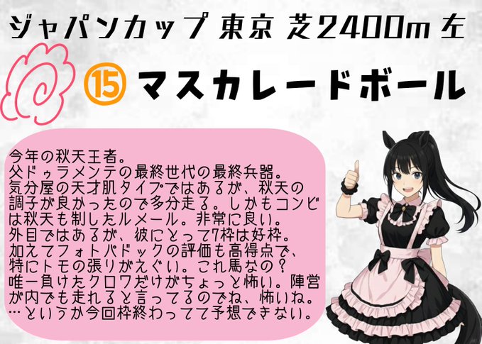 梅田・京橋 おたくばぁ えんじぇるこはく@AGLpro_kohaku·コハクチャンがジャパンカップの予想を教えてくれたよ‼️ ※コハクチャンはジャスティンパレス依存性だよ 今回枠順が極端すぎて予想できないけど結局三連単に賭けるよ(中毒)1237