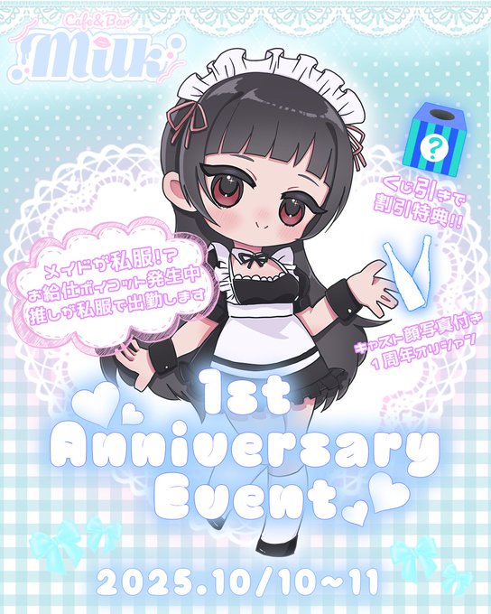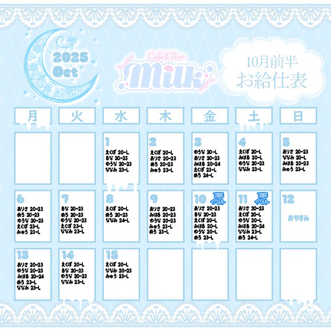 固定🎀メイドコンセプトBar Milk🎀@Bar_Milk_fuse·🎀Milk🎀 10月前半🎀お給仕表 10/10.11 1周年イベント🎪 10/12 店休 ⏱️OPEN 20時〜 お待ちしております♡ ➽──────────❥ ✨メイドキャスト募集中✨ ■TEL■ 0667436164 ■場所■ 大阪府東大阪市足代新町3-11布施ナインピア1階 #コンカフェ #ガールズバー #メイド #大阪 #布施1212