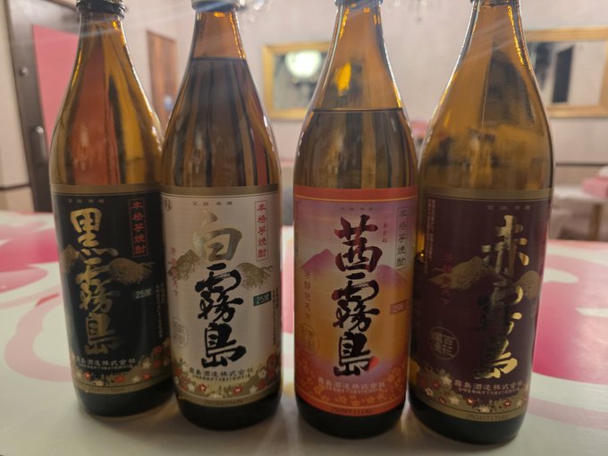 ちはやふる@chihayafuru2025·芋焼酎好きわかなちゃんのために、 霧島各種用意しました🤗 飲み放題メニュー商品になりますので、お客様も是非お試しください! #茜霧島 #黒霧島 #白霧島 #赤霧島 #芋焼酎好きな女は大体モテる764