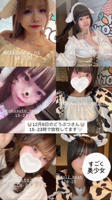 梅田・京橋 牧場Story牧場Story@大阪梅田コンカフェ@_bokujo_story·【12月8日のどうぶつさん🦙🤍】 のぞみ @99_bkst 15-23 うらん @uranx_0macoron 15-19 れな @bokusuto_rena 15-23 めい 18-23 める @bokusuto_meru 18-23 どーる @bkst_Doll 20-23 15-23時で放牧してます🌱 #大阪 #梅田コンカフェ #コンカフェ #コンカフェ営業3392