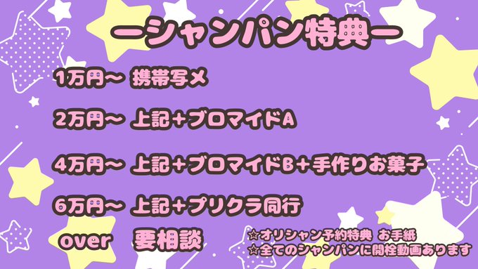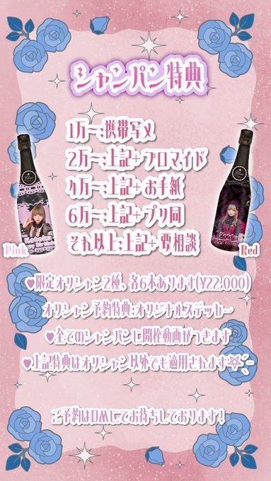 梅田・京橋 競馬Cafe&Bar IDOL.HORSEみ く@19.20生誕祭@miku_idolhorse·10時間こちら生誕祭のシャンパン特典になります! 手作りお菓子は妹に見てもらいながら作るので大丈夫です‼️‼️(なにが?) 予約特典はお手紙になります💘 ちゃんとめちゃくちゃ丁寧に書きますので! 限定2種類6本ずつ、計12本になりますのでDMにてぜひご予約お待ちしております🙂↕️引用み く@19.20生誕祭@miku_idolhorse·10時間返信先: @miku_idolhorseさんシャンパン特典こちらになります! オリシャン予約してくださった方にはお手紙とか書いちゃうにょーん 予約、質問等ありましたらDMください!422770