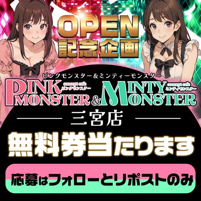 こう君🔥ぴんもん🔥さんがリポストピンクモンスター&ミンティモンスター神戸三宮@pinmon_minmon·10月8日順次DMにて当選の発表を行なっております✨ またXでのイベントも企画していますのでお楽しみに🫶引用ピンクモンスター&ミンティモンスター神戸三宮@pinmon_minmon·9月17日9/16(火)プレオープン🎀 神戸三宮に地域最大級のコンカフェがOPEN💖 ✨オープン記念企画✨ フォロー+リポストで抽選30名様に 【無料券】をプレゼント🎁 📅応募締切:9/30(火)まで 💌当選はDMにてご連絡いたします✨ 制服かわいいキャストたちが 皆さまをお待ちしてます🥰7131,840