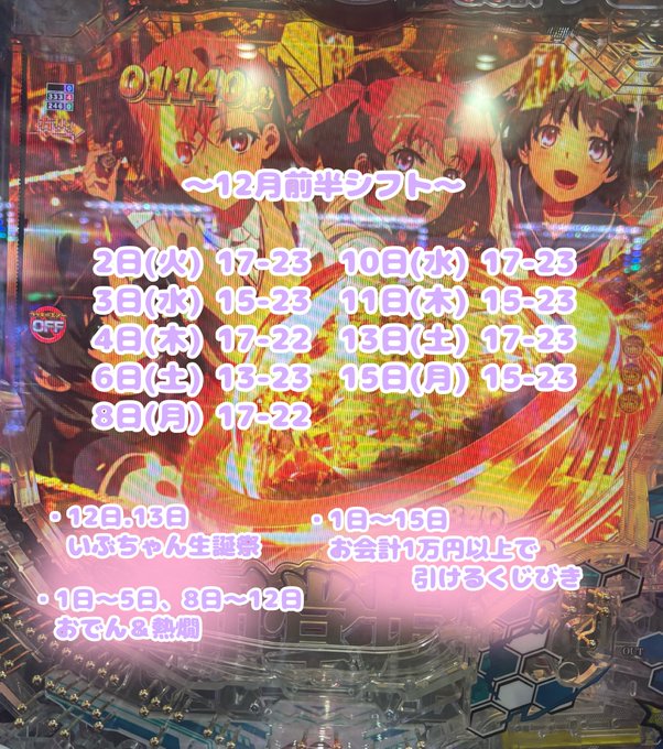 梅田・京橋 競馬Cafe&Bar IDOL.HORSEみ く@miku_idolhorse·12月前半シフトです!日曜いません!お土産買ってくるから許して🥲すみません🥲 イベント盛りだくさん😻ツリーに貼ります! 12.13日はいぶちゃんの生誕祭あります!みんなで盛り上げましょー!✨1122295