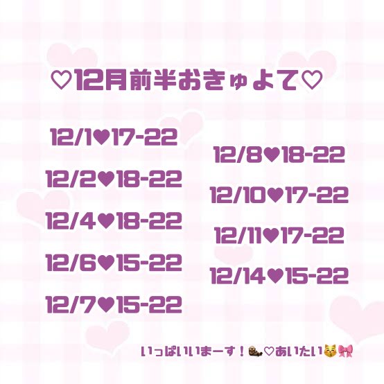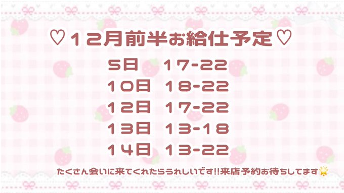梅田・京橋 ちはやふるちはやふるさんがリポストもあ@moa_chifuru·12月前半お給仕予定⋆˙⟡ 前半のお給仕予定です❕今月もたのしそーなイベントたくさん🎁🎄 いっぱい会いにきてねー!!! 来店予約どしどしお待ちしてます₍ᐡ⊃ᖛ꒳ᖛ⊂ᐡ₎♡ #コンカフェ #コンカフェ嬢 #大阪 #梅田 #コンカフェ営業1114242