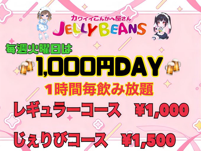 梅田・京橋 カワイイこんかへ屋さん JELLY BEANSななせさんがリポストコンカフェ🍬JELLY BEANS🍬@CAFE_JELLYBEANS·☀️11/25 出勤情報☀️ ⏰16-23 はな @JELLY__hana ⏰17-23 あの @jelly__ano ⏰17-22 りる🔰 @jelly_riru ⏰19-23 ななせ @jelly_nns #大阪コンカフェ #梅田コンカフェ 飲み放題1000円DAY‼️ お得に飲める日‼️お待ちしてます☺️24220