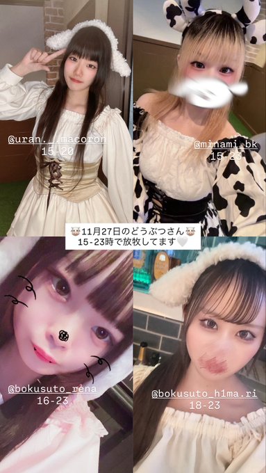 梅田・京橋 牧場Story牧場Story@大阪梅田コンカフェ@_bokujo_story·【11月27日のどうぶつさん🦙🤍】 うらん @uranx_0macoron 15-20 みなみ @minami_bk 15-23 れな @bokusuto_rena 16-23 ひまり @bokusuto_H1MARI 18-23 15-23時で放牧してます🌱 #大阪 #梅田コンカフェ #コンカフェ #コンカフェ営業2112