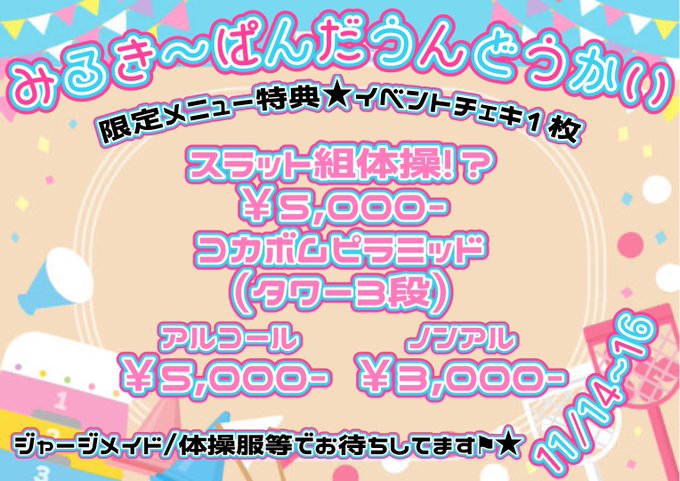 梅田・京橋 CAFE&BAR みるき~ぱんだメイドcafe&bar みるき~ぱんだ@_milky_panda_·お給仕ラインナップ🐼 🏁みるぱん運動会🏃💨 15時 ふわか @fuwaka_milpan 17時 夢美 @yumemi_milpan 18時 ひな @hina_milpan 19時 なみ @nami_milpan ゆゆ @yuyu_milpan34430