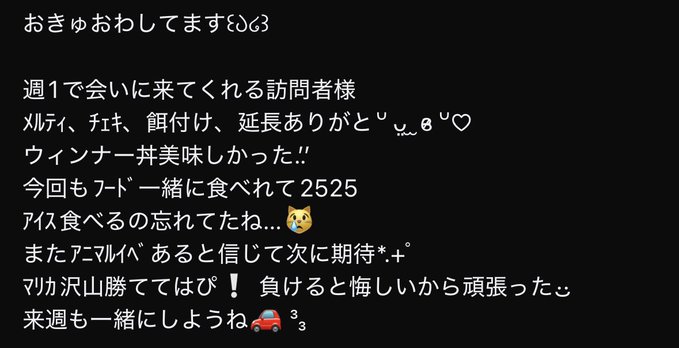 沖縄・那覇 でりしゃすぽしゃけ桃天えな🍑でりぽけメイド@ena_delipo·21時間うーん、何故かいまひだりちゃまとお肉食べてる、なんでだ🙂よっぱぱになった記憶はないのに🙂お肉美味しいです🍖引用桃天えな🍑でりぽけメイド@ena_delipo·1月31日🍑えなぴおきゅいん🫶 1月最後のお給仕だー🥰1月早かった❕ 今日終わったらえなぴお休み期間になり暫く会えないちゃんなのでご帰宅してくれたら嬉しいにゃーん😸🎶 久しぶりの土曜日にドキドキそわそわしてる〜〜〜ふふふ〜〜〜❕ のみべもあればステージ欲もあるわがままえなぴお給仕楽しむぞー👊💗 x.com/deli_poke/stat…412398