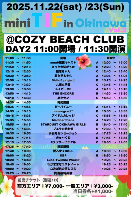ama9(あまきゅー)【公式】沖縄コンカフェ|キャスト募集中@ama9_official·5時間🌺mini TIF in OKINAWA タイテ発表❕🌺 あまきゅーの出演は、 11月23日(日)11:30〜です🎤 2日目の最初から盛り上げることができるように頑張ります💪🏻 出演キャストは近日公開します👀 🔽チケット🔽 https://tiget.net/events/424633 #沖縄 #那覇 #コンカフェ引用TIP&TIF 公式@TIP_TIF_staff·5時間⏰タイムテーブル発表⏰ 11/23(日) #ミニTIF in OKINAWA vol.2 会場:COZY BEACH CLUB(コージービーチクラブ) 開場11:00 開演11:30 🎫チケット発売中🎫 https://tiget.net/events/424633 💐出演💐 #アイカレ #あまきゅー #OBP #きっと大切だった #キミそら #きゅ〜くる #九州女子翼 #アンコール #シブサン7111,037