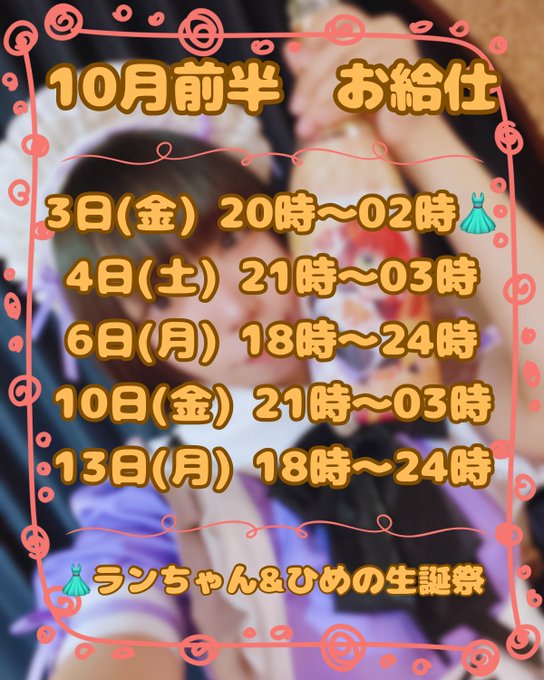 固定沖田ひめの🪞@でりぽけメイド@himeno_delipo·《🪞10月前半 お給仕表🪞》 ▶︎3日(金) ランちゃん&ひめの 生誕祭❗️ お互い初めての生誕祭です✨ 手作りおでん🍢あり! 当日はドレスでお給仕します👗 ▶︎木コス ハロウィン仮装です🎃 お給仕ないけど私も仮装したいよ〜🥹 季節の変わり目ですので、体調には気をつけましょう!8129