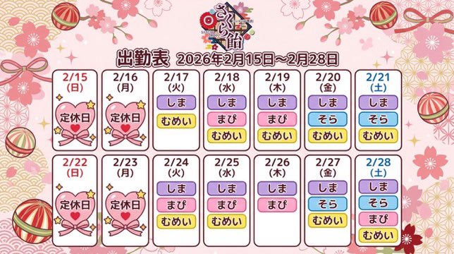 静岡・浜松 さくら飴 - 富士市京風サブカル喫茶&バー🌸さくら飴🍬@SakuraDrop_Fuji·出勤表に誤りがあった為 修正版です🙇♂️ 2/18(水)本日も元気に 20:00オープンです🌸 #さくら飴 #さくあめ #コンセプトバー #コンカフェ #アニソン #アニソンバー #バー #静岡 #富士市 #富士宮 #沼津 #三島 #ガルバ #ガールズバー #サブカルバー #アニクラ #ボカロ #シーシャ1137