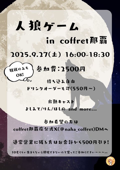 かな@coffret那覇@kana_coffret·8時間明日!あるよ🐺🐺🐺 まだ間に合う!やろう!!引用メイドカフェcoffret沖縄那覇店🌺コフレ@naha_coffret·8月10日🌙🌙🌙🌙🌙🌙🌙🌙 コフレで人狼ゲームやろうや〜🐺 9.27(土)16:00-18:30 2500円 🌙🌙🌙🌙🌙🌙🌙🌙 リベンジ❣️ 人数が集まらないと開催できないので何卒…🙏 参加表明はDMもしくは店頭でよしみて/りん/ほしの へお伝えください🙏 ご質問もお気軽にどうぞ💌 キャストはあと1〜2名増えるかも〜💞 #人狼8419