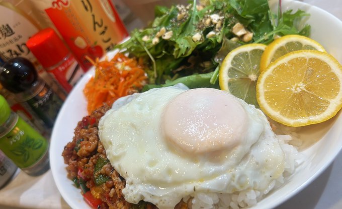 モモ×チャンチャン@momochann_622·🍋本日🍋 サラダ キャロットラペ ガパオライス ドレッシングはオリーブオイルブラペレモン汁りんご酢バジルが1番美味い₍ . ̫. ₎971