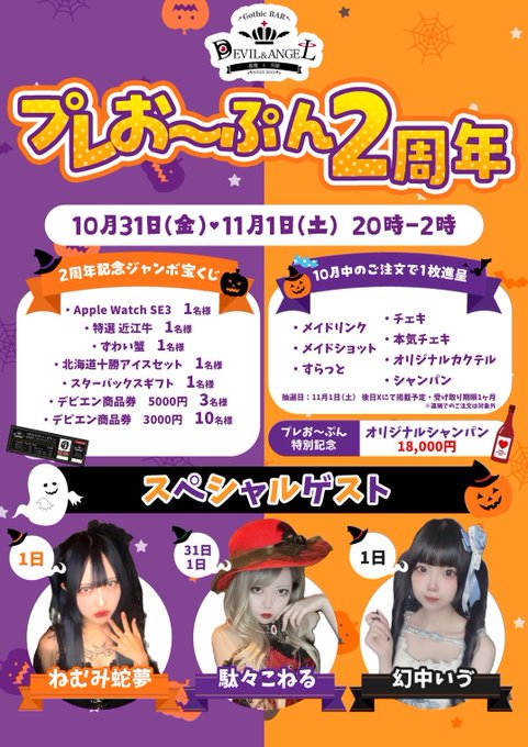 東雲のい🐏デビエンメイドさんがリポストGothicBar デビル&エンジェル@devil_angel_oki·🎂デビエンぷれお〜ぷん2周年🎂 👿10/31&11/1👼 20時〜2時開催✨ Apple Watch等豪華景品が当たる 🎯デビエンジャンボ宝くじ🎯 期間:10/1〜10/31 記念オリシャンも登場🍾 💖スペシャルゲスト💖 ねむみ蛇夢/駄々こねる/幻中いゔ129481.1万