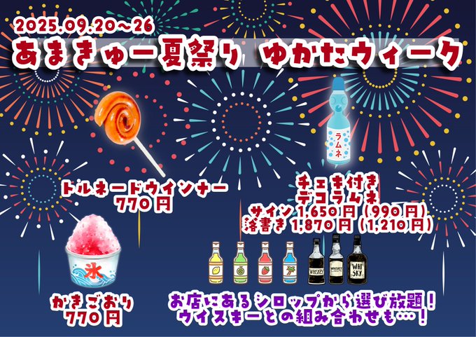 にゃぴ🐈⭐あまきゅー@nyapi_ama9·9月17日イベントフードたべたい❗️🤩🤩にゃぴなら5個は食えるね😏 デコラムネがんばったよ❗️たのんで❗️😍🙏 浴衣着るのたのしみ😍😍😍引用ama9(あまきゅー)【公式】沖縄コンカフェ|キャスト募集中@ama9_official·9月17日👘 あまきゅー夏祭り ゆかたウィーク 👘 #あまイベ イベントメニュー紹介🏮 ☆トルネードウインナー 誤発注で多めに届いてしまったので、今回はキャストも同額で同じサイズのものを食べられます😣❣ ☆チェキ付きデコラムネ x.com/ama9_official/…さらに表示14186