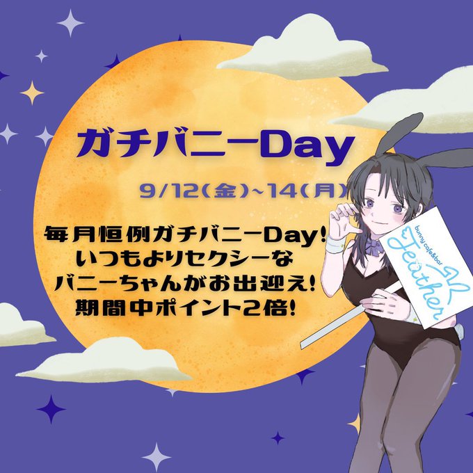 Feather໒꒱⋆*高知bunny cafe&bar@feather_bunny_·꒰ঌ9/14(日)のバニーちゃん໒꒱ 20:00~ りあ@Rhea_TsunaTsuna 22:00~ 死檻@Shiori_feather 23:00〜 のあ@noa_Feather 飼い主様のご帰宅をお待ちしております!✨ #高知コンカフェ #コンカフェ2137