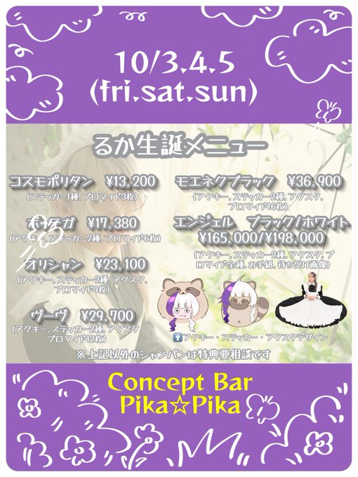 Concept Bar Pika☆Pika@pikapika_0305·🎂10/5(日)🎂 (日)も絶賛営業中! 20時~01時(最終入店24時) 本日🟣るか生誕祭 最終日✨ シャンパン特典有 👽✕6⤵️ 🟣るか🎂 @Ruka_pikapika つづみ @tuzu_pikapika つむぎ(早上) らむ @rmpikapika ゆあん @yuan_pikapika りん @rrin_pikapika お待ちしてます‼️ #コンカフェ #アイドル3158