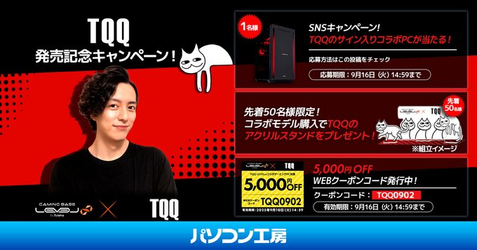 れしあ@Reshia_vampire·9月6日#TQQxレベルインフィニティ引用LEVEL ∞(インフィニティ)【公式】@LEVEL_INF·9月2日✨「TQQ」コラボゲーミングPC発売記念✨ コラボPC発売記念!抽選で1名様に、TQQのサイン入りコラボPCを🎁 [応募方法] ① @tqq999 と @LEVEL_INF をフォロー ② 本投稿に #TQQxレベルインフィニティ を付けて引用ポスト👍 応募期限:9/16(火)14:59迄さらに表示2476