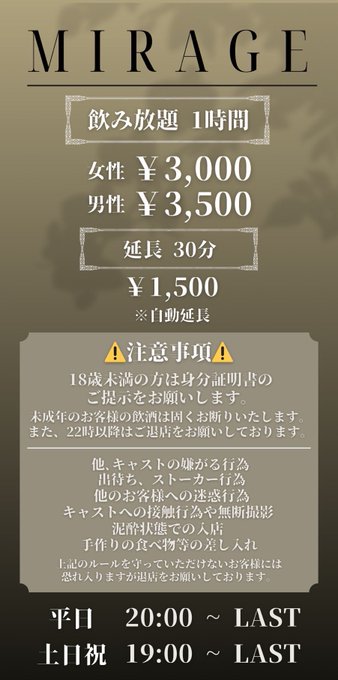 のあさんがリポストMirage🪞高知男装コンカフェ@mirage_kochi·〚 ✦⋆一お知らせ一⋆✦ 〛 本日より営業時間の変更と 男性のご入店が可能となりました!✨ 【 営業時間⏱ 】 (火-金) 20:00-3:00 (土-日祝) 19:00-3:00 【 男性入店可 】 ・チケット購入必要なし! ・お1人様から入店可能! ✨皆様のお越しをお待ちしております✨ #男装コンカフェ #Mirage高知16172,334